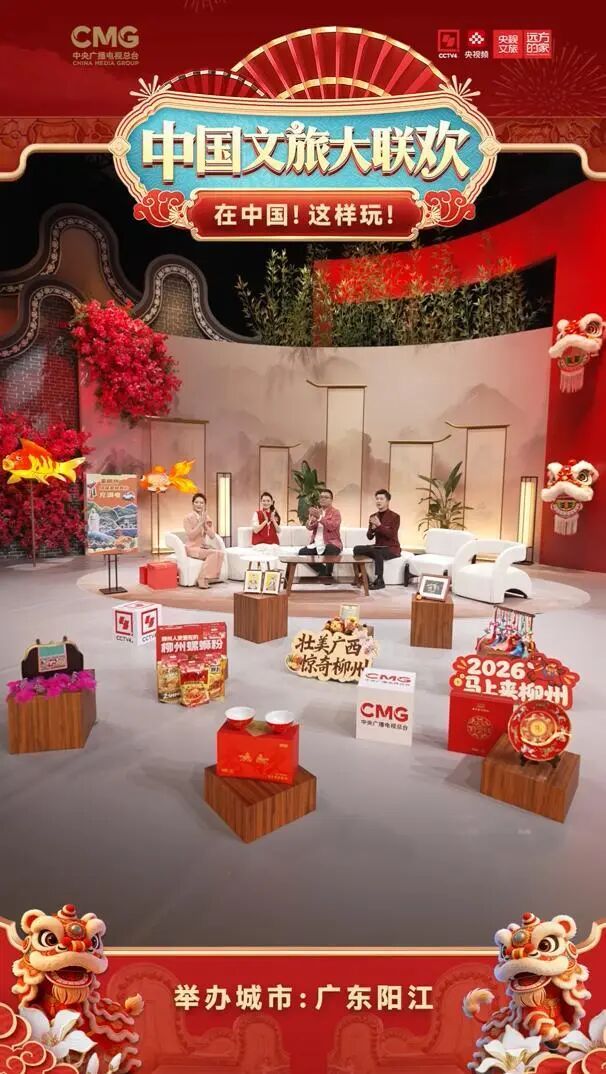 2026年2月7日,柳州市受邀参加由中央广播电视总台华语环球节目中心联合广东省委宣传部、阳江市委市政府主办的2026《中国文旅大联欢》新春篇,并亮相《在中国!这样玩儿!》全国文旅城市新春推介活动直播间与线下集市,以“2026马上来柳州”为主题,通过CCTV4、央视文旅、《远方的家》节目新媒体矩阵等各新媒体平台,全方位展现城市文旅特色与独特魅力,向全国观众发出诚挚的新春游玩邀约。