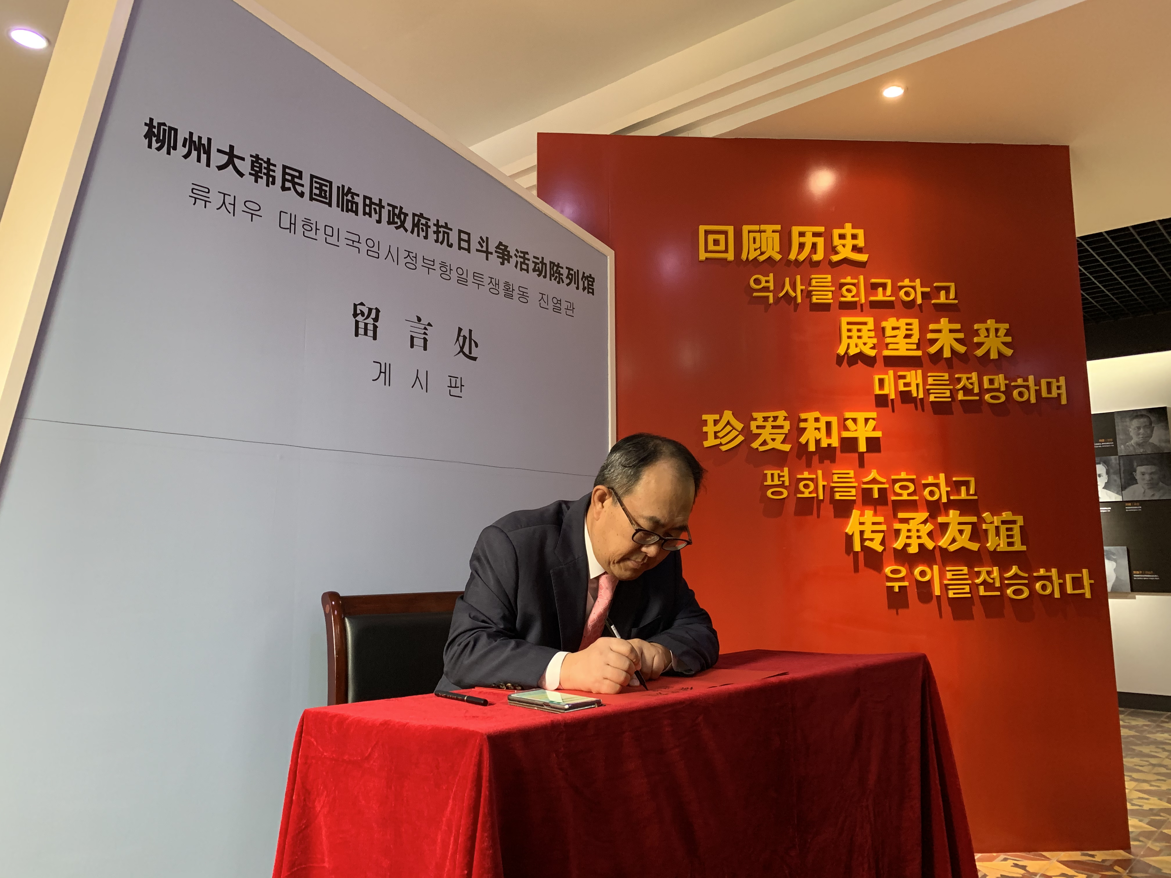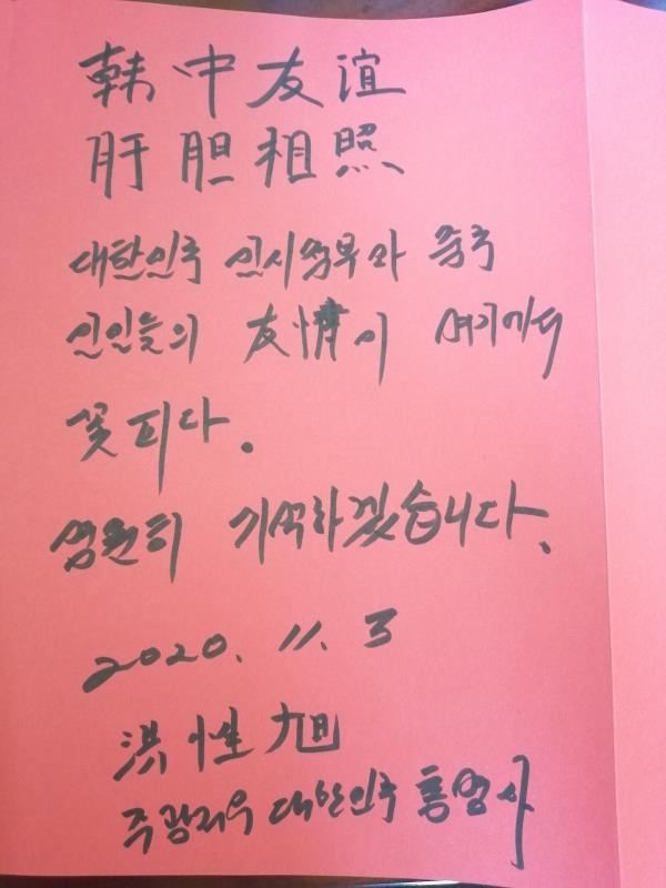 洪性旭总领事一行的到访是陈列馆重新开放后迎接的第一批外宾团体参观,洪性旭总领事也为陈列馆的再次开放献上了鲜花以及诚挚的祝福。在讲解员的引导下,洪性旭总领事一行观看了柳州大韩民国临时政府抗日斗争活动陈列馆内珍藏的大量图文史料,感叹当年韩国民众与柳州人民在抗战中经受的磨难,珍惜双方在共同抗击日本侵略中结下的友谊。在印有两国人民友谊美好寄语的留言墙下,洪性旭总领事写下感言:“韩中友谊,肝胆相照!大韩民国临时政府和中国人民间的友情之花在这里盛开,永远铭记在心!”