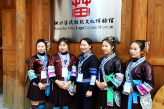 展演结束后,大家走进融水苗族拉鼓文化博物馆参观。该馆坐落于“中国广西苗族拉鼓文化圣地”三百尧告苗寨核心区,为占地500平方米的三层纯木结构苗族吊脚楼,飞檐翘角间尽显苗乡建筑特色。