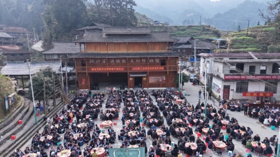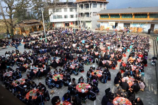 ▲当天,尧告村摆百家宴庆祝苗年,来自各方的客人和当地各族群众聚在一起共享苗家美食。
