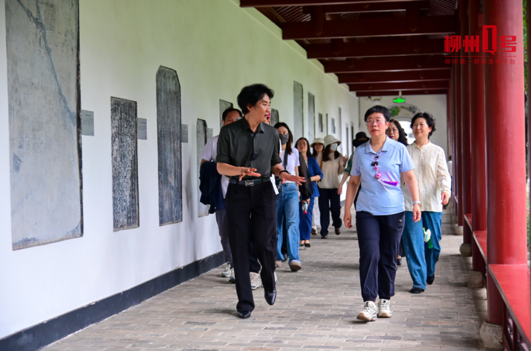 柳州市博物馆馆长程州(左前)向蒙曼(右前)介绍柳侯祠。