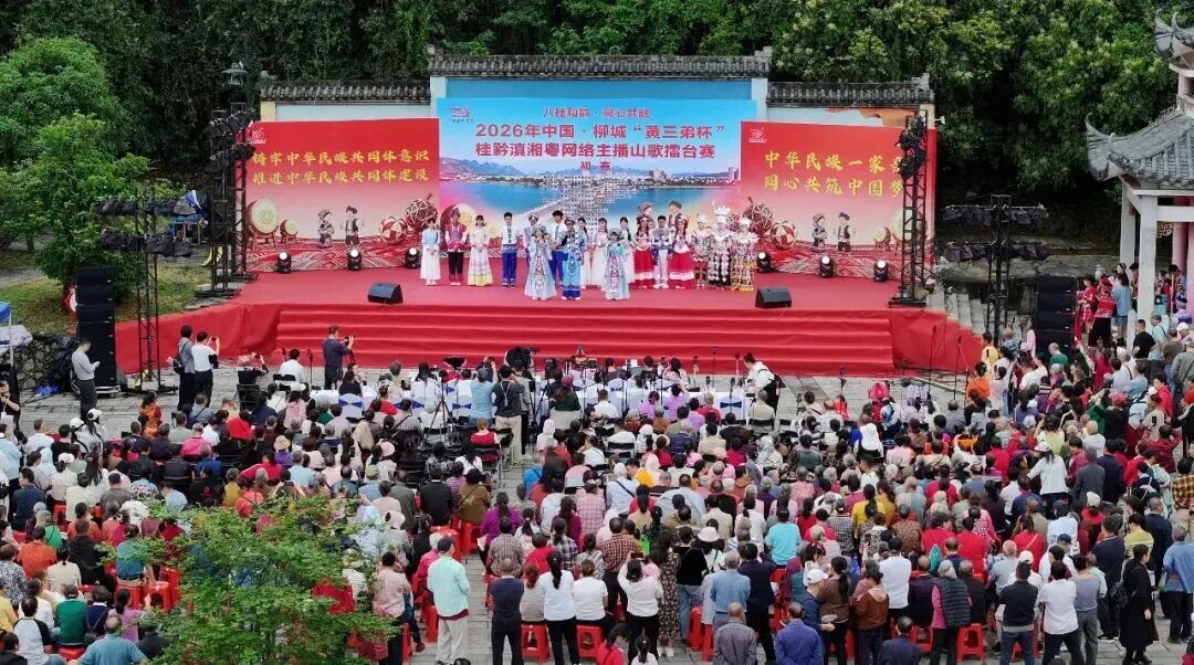 柳城县举办2026年中国·柳城“黄三弟杯”桂黔滇湘粤网络主播山歌擂台赛暨柳城县民族团结进步宣传月系列活动,来自广西、贵州、云南、湖南、广东五省区的18支参赛队伍在融江河畔,以歌会友、以歌传情,掀起一场传统山歌与网络传播交融的文化盛宴。