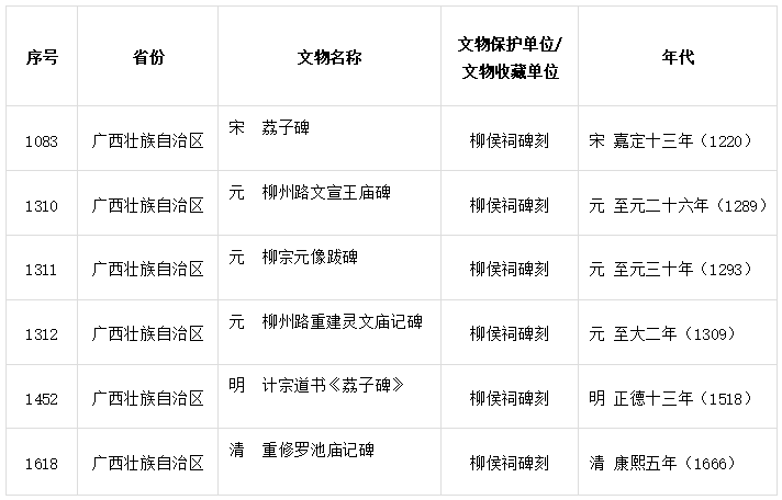 为加强我国古代碑刻石刻文物保护管理与利用,近日国家文物局公布了《第一批古代名碑名刻文物名录》(以下简称《名录》),广西碑刻、摩崖石刻共有41通(方)文物入选,其中柳州柳侯祠《荔子碑》《柳州路文宣王庙碑》《柳宗元像跋碑》等6方碑刻文物入选《名录》。