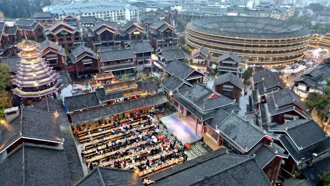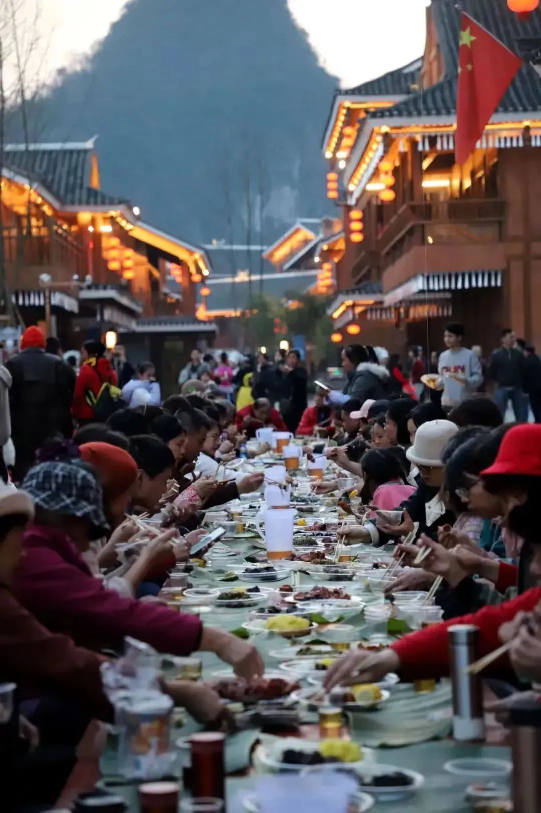 国家级夜间文化和旅游消费集聚区月也侗寨景区正月初三至初五连续三天宴请游客免费吃百家宴,牛王争霸赛、“高山流水”、特色民族歌舞热情招待四方游客。