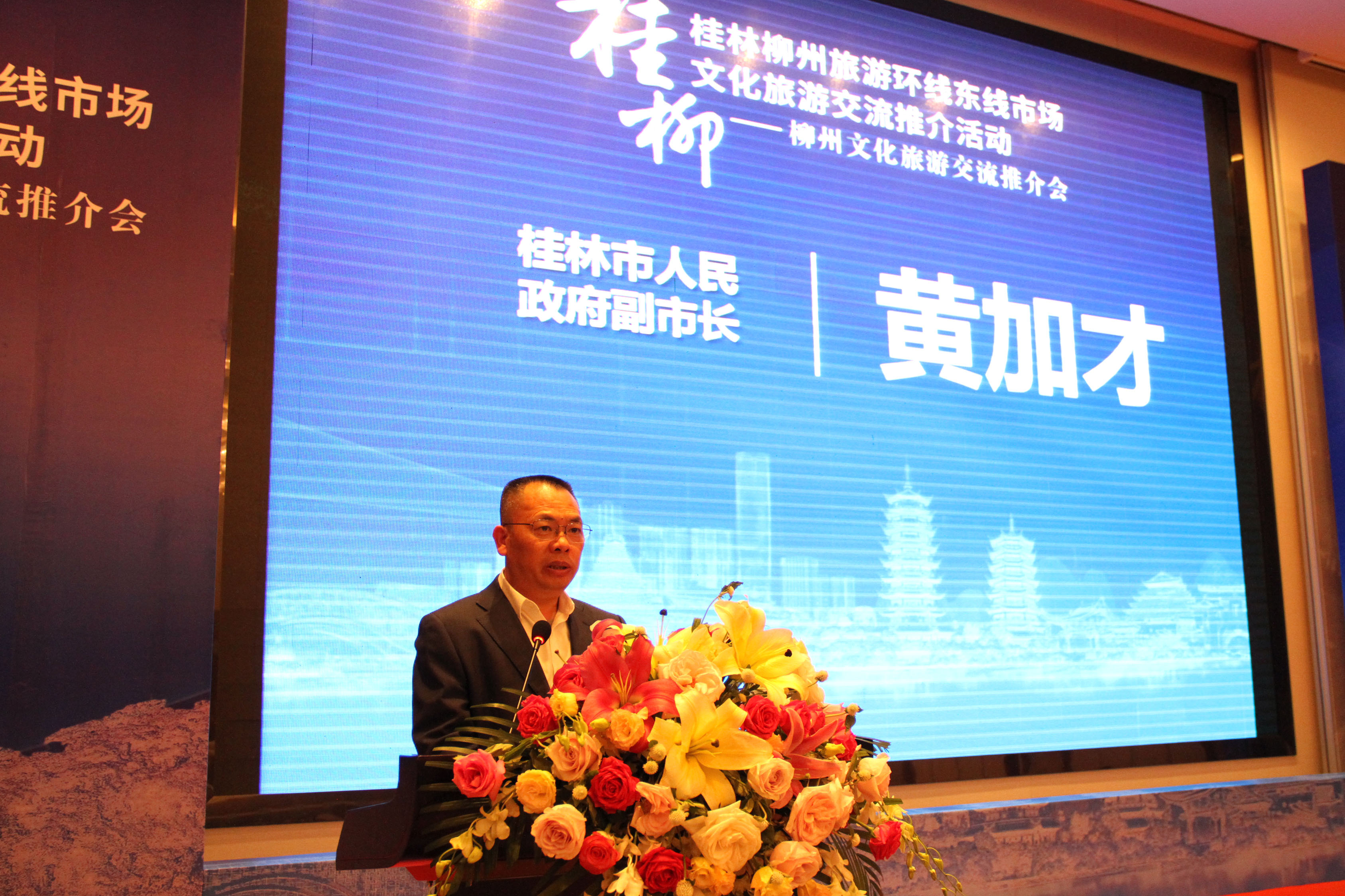 桂林市政府副市长黄加才致辞,他希望两市在旅游景区合作开发特色旅游产品和旅游线路设计,在旅游市场联合营销、旅游市场秩序维护、旅游突发应急事件处理等方面加强合作,共同构建区域旅游大市场。