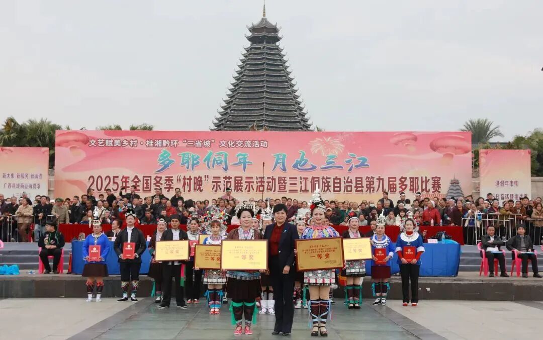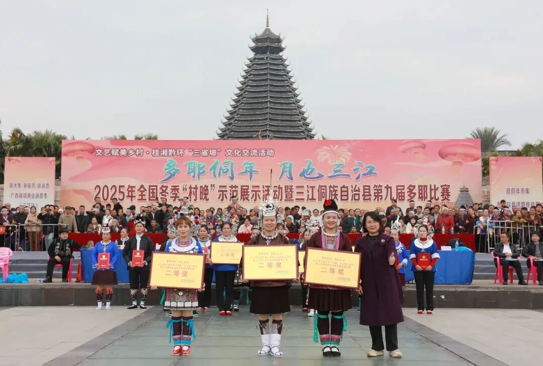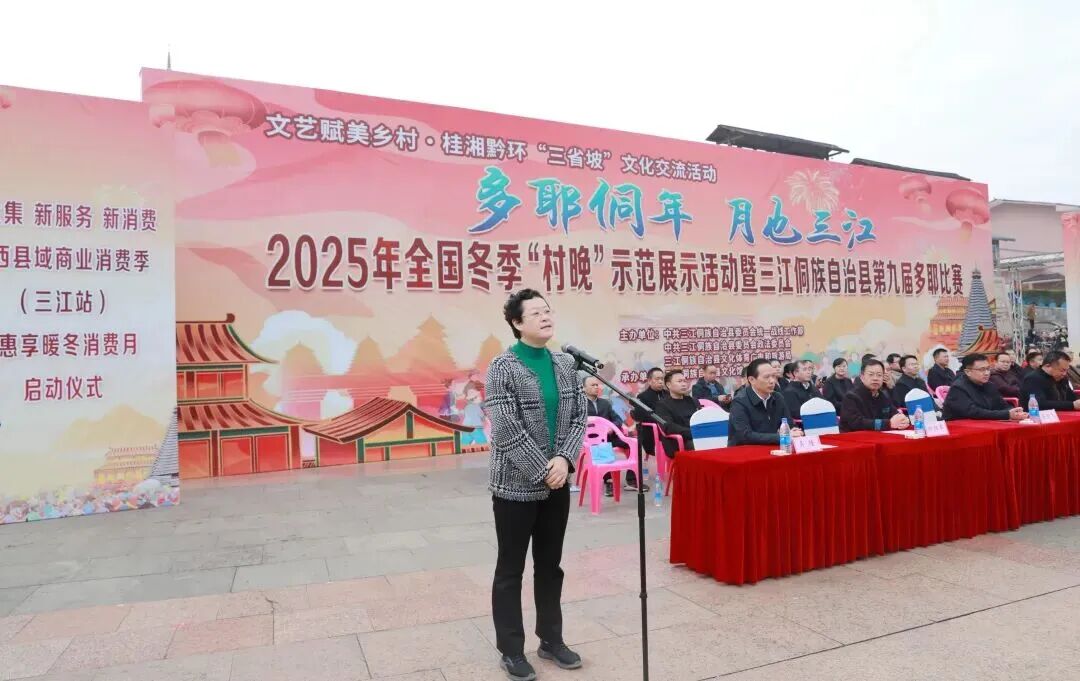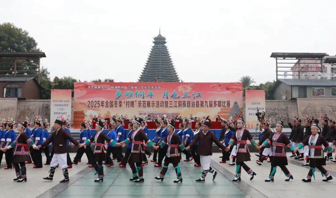 12月20日,“多耶侗年 月也三江”2025年全国冬季“村晚”示范展示活动暨三江侗族自治县第九届多耶比赛在县城多耶广场举行,来自三江的22支参赛队同台竞技,以歌传情,以舞会友,为现场观众献上一场精彩纷呈的文化盛宴。三江县委书记贺莹宣布活动开幕,柳州市文化广电和旅游局党组成员高福彪在开幕式上致辞。